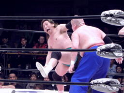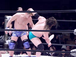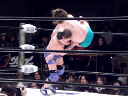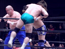 TAKAが入って浜田をコーナーに振る、浜田コーナーに飛び乗ると突っ込んできたTAKAにスイングDDT(右写真)、ようやく鶴見にタッチ。