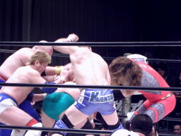 TAKAがマイティを捕らえアブ小がコーナーからチョップ(左写真)。
