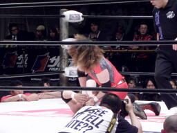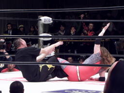 引き倒してエビ固め(右写真)、カウント2。高木ニーリフト打ち込んでポイズンにタッチ。