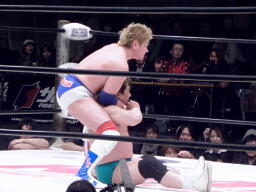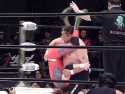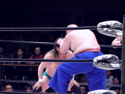 戸口ボディにパンチ入れてブレーンバスター(右写真)。10分経過。