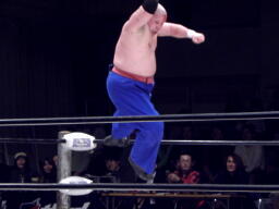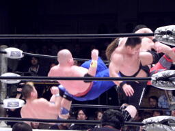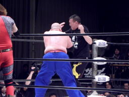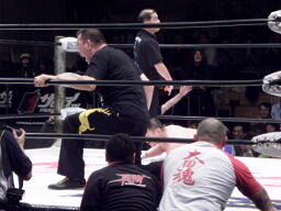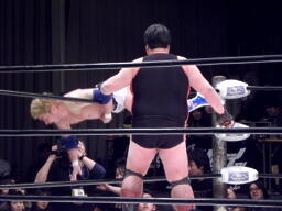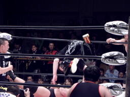 TAKAドロップキック、高木クローズライン、カウント2。高木ロープ際の小鹿にもう一発クローズライン、小鹿かわすと高木はエプロンに出てしまう(左写真)。