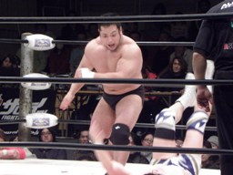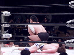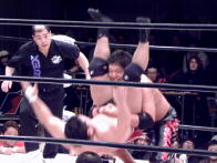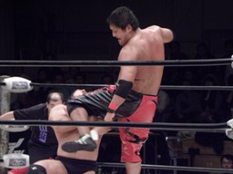 KAZMAボディへのパンチ連打、ブレーンバスターに行こうとするが義人ブロックして逆にブレーンバスター(右写真)、石川にタッチ。