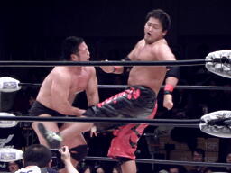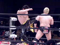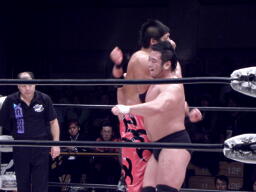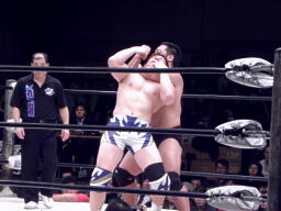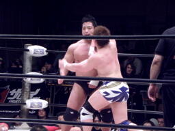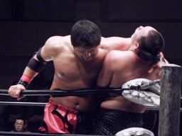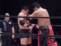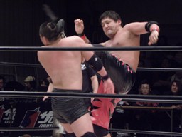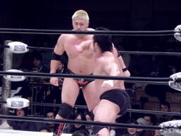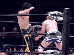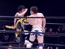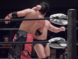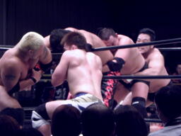 ロックアップ、関本がヘッドロック、義人ロープに振る、関本ショルダーブロック(右写真)。関本首投げからスリーパー、義人ロープ。義人KUDOにタッチ。KUDOヒザ蹴り、首投げからサッカーボールキック。関本も首投げからストンピング、火野にタッチ。