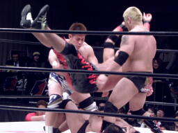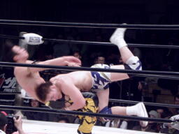 関本投げっぱなしジャーマン(左写真)、火野すぐに立ち上がってラリアット、ダブルノックダウン。KUDOと義人にタッチ。