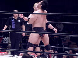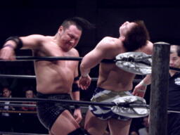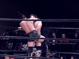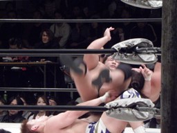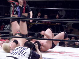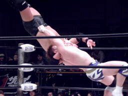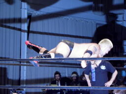 石川ジャイアントブーツ、ツームストーンドライバー、カウント2。スプラッシュマウンテンに行こうとするがKAZMAがカット。KUDOバズソーキック、関本にタッチ。関本とKAZMAクロスボンバー(右写真)。