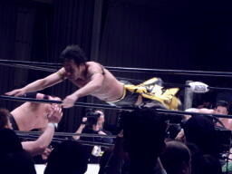 KUDOが火野と義人を場外に落としトペ狙う、関本阻止してロープに振る、KUDOは関本のラリアットをかわしトペ・スイシーダ(右写真)。