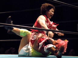真琴ボディスラム狙い、マサ子ブロックして逆にボディスラム。ヒザ蹴り、ロープに飛ぶ、真琴はカウンターで真琴キック。ブレーンバスターホールド、カウント2。さらにドロップキック(右写真)、マサ子吹っ飛んでチェリーにタッチ。