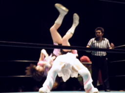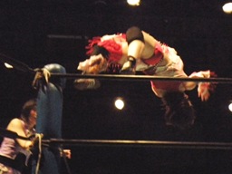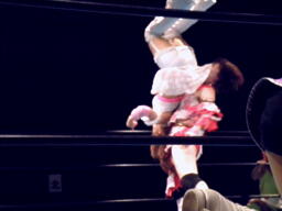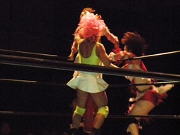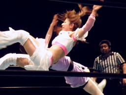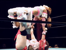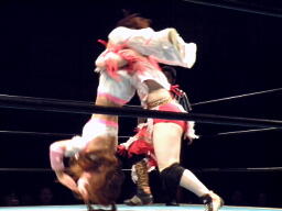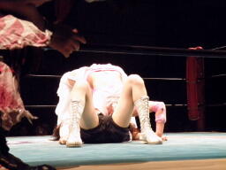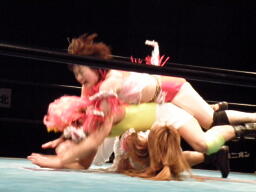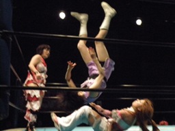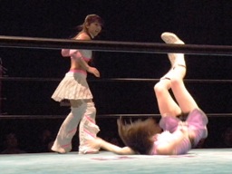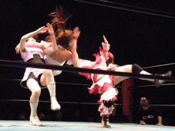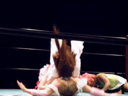 さくらダブルアーム式背骨折り(右写真)。2発目チェリーブロックしてロープに飛ぶがさくらはキャッチして風車式背骨折り、カウント2。