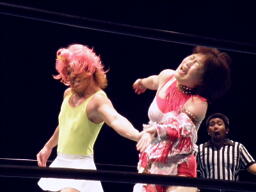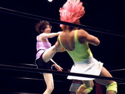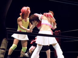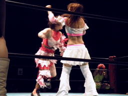 さくら逆水平(右写真)、チェリーはエルボー。さくらドロップキック、へアホイップ、真琴にタッチ。5分経過。