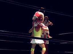 マサ子がさくらを肩車、チェリーがコーナーに上る(右写真)。