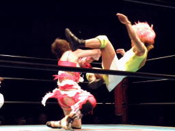 さくらと真琴ダブルでロープに振る、チェリーは2人にフライングネックブリーカードロップ(左写真)、マサ子にタッチ。