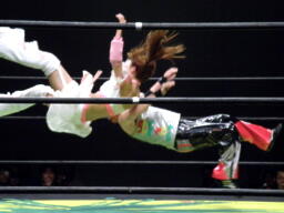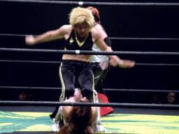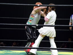木村合体式ダブルフットスタンプ(左写真)、カウント2。続いて江本がアラビアンプレス式フットスタンプ、なのだが、失敗してトップロープから転落したようにしか見えなかったよ。よくそういう不完全なムーヴを客の前でやる気になるもんだ。