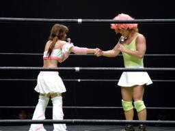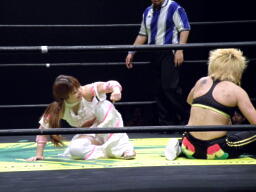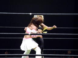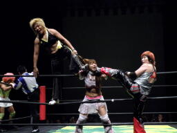 アマンドラダブルでマサ子をコーナーに振る、マサ子はエルボーを2人に連打(右写真)、チェリーにタッチ。
