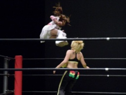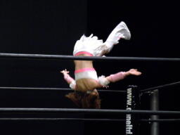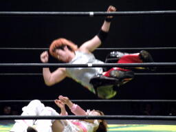 チェリーコーナーに上ってチェリートーンボム(左写真)、しかし中川がカット。江本がイスをチェリーの顔面に投げつける、鼻にヒットしチェリー鼻血。鼻骨折れてなきゃいいが・・・。