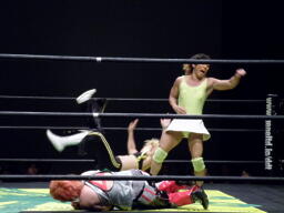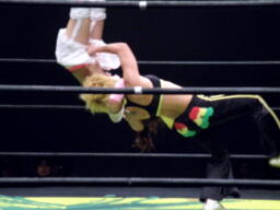 江本コーナーに振って突っ込む、チェリーフライングネックブリーカードロップで返し(左写真)マサ子にタッチ。