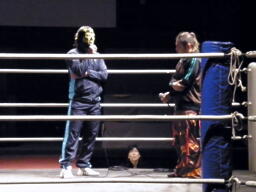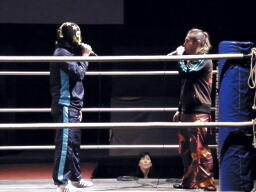 休憩中、726と清水がリングに。726「ちょっとマーケティング本部長を呼んでくるからここで待ってて。」(右写真)