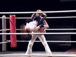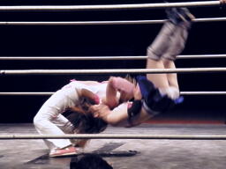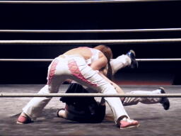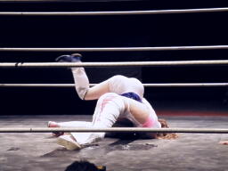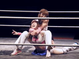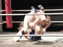 チェリーボディスラムから首4の字。リリースしてチキンウィング(左写真)。5分経過。