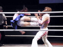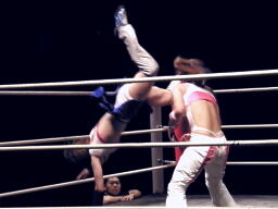 チェリーダブルリストアームサルト(左写真)、カウント2。ミサイルキック、これも2。
