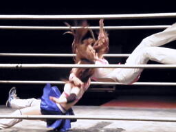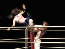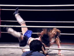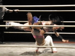 チェリーは藤本をロープに押し込むと自分もロープに飛んでフライングネックブリーカードロップ(左写真)。これはいい動きだ。