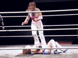 チェリーターンバックルにぶつけてコーナーで踏みつけ。対角線コーナーに振ると藤本は三角飛びボディアタック、カウント2。藤本首投げからサッカーボールキック(右写真)、カウント2。