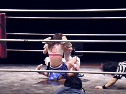 チェリー再度ジャーマン狙う、藤本前転してヒザ十字(左写真)、チェリーロープ。ロープにもたれかかったチェリーに藤本は619、カウント2。