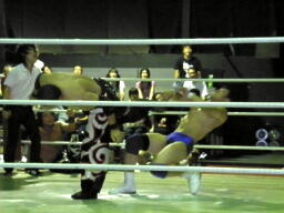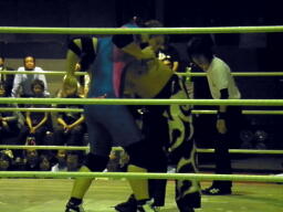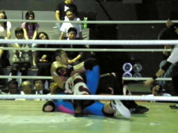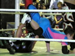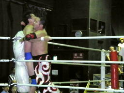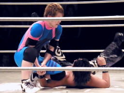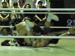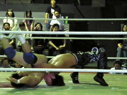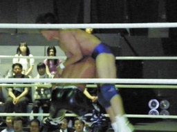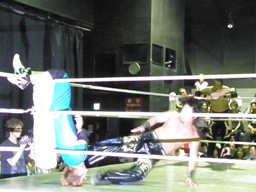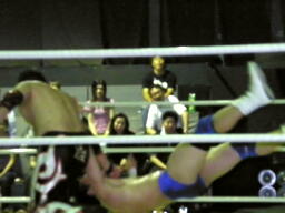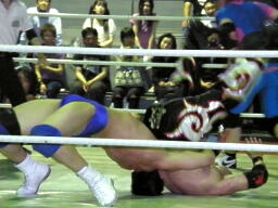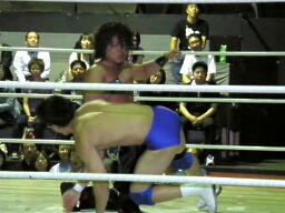 佐々木腕をひねる(右写真)、石川切り返してヘッドロック。佐々木カニばさみ。石川は矢野にタッチ。