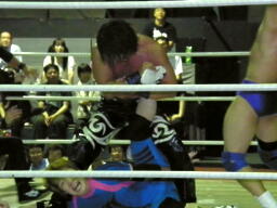 佐々木パワーボム(右写真)、カウント2。HARASHIMAにタッチ。HARASHIMAはコーナーから「チェストー!」ミサイルキック、吹っ飛んだ石川はそのまま矢野にタッチ。