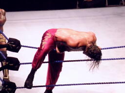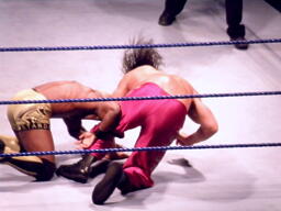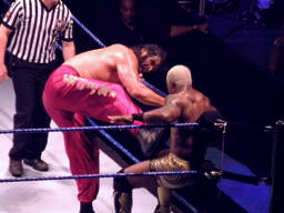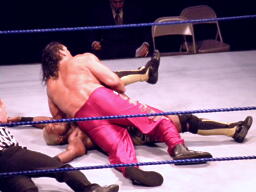 ロープを背にしたベンジャミンにカーリーがビッグブーツ、ベンジャミンかわしてカーリーは足をトップロープに引っ掛ける。