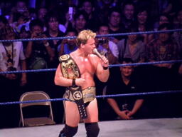 ジェリコがタッグベルトを肩に掛けて入場。ヒールだが人気は高い。「Y2J」チャントも起きる。ジェリコはしかしマイクを握ると「今『Y2J』とか叫んでる奴、今すぐ黙れ。俺はもうそんなレベルではない。さらに先に行ったベストレスラーだ。日本は俺の第二の故郷なんかじゃない。」まあそう言う時点で認めてるようなもんですけどね。