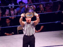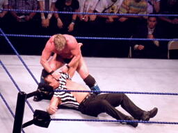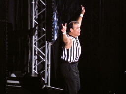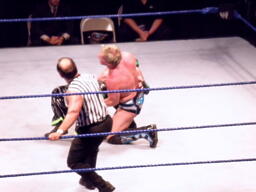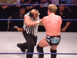 レフェリーのリッキーに暴行、シャツを剥ぎ取り、ボディスラムで投げる。