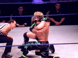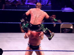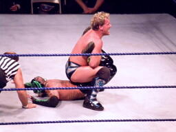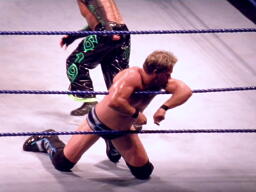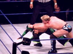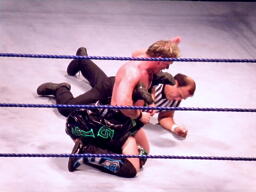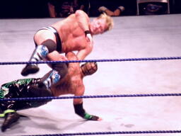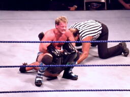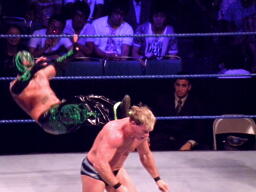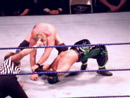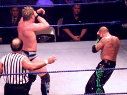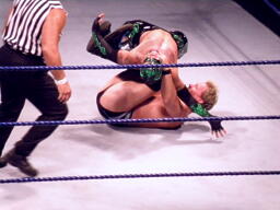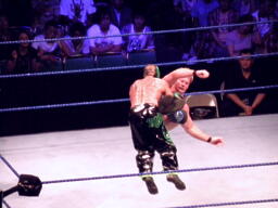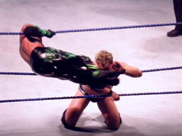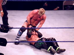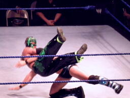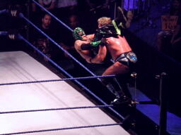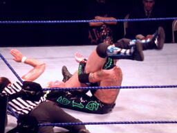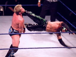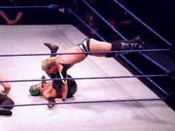 ジェリコ首絞め、スティムボートが警告。ジェリコサッカーボールキックからカバー、ミステリオキックアウト。ジェリコ両手を押し付けて再度カバー、ミステリオブリッジで返す。