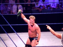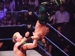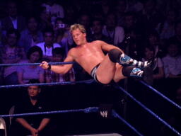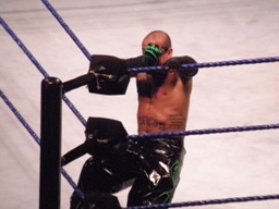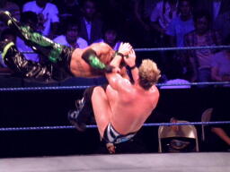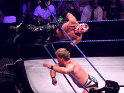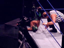 ミステリオがリングに戻るとジェリコはコーナーに上げる、ミステリオ突き落としてクロスボディ。