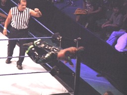 場外戦の後ジェリコ一旦リングに戻るがミステリオが上がってこないのでジェリコまた下に降りる。ミステリオスチールステップを蹴る、ジェリコに激突、ジェリコ場外でダウン。