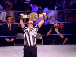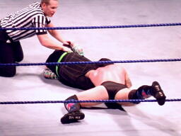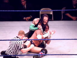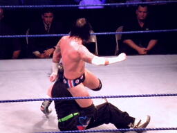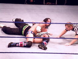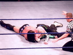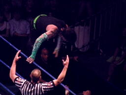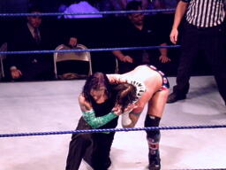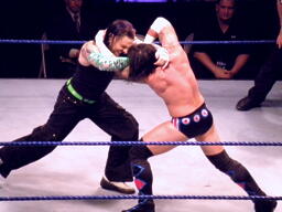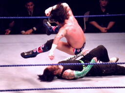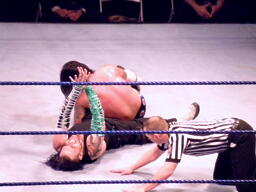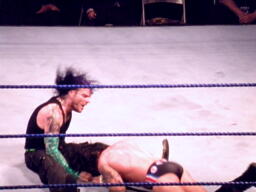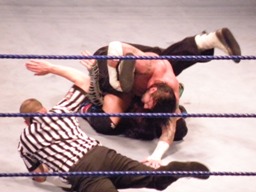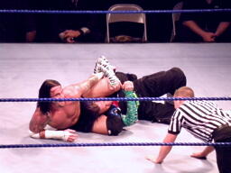 パンチの打ち合いからジェフはツイスト・オブ・フェイト、パンクブロックして肩に担ぐ、ジェフエビ固めに切り返す、パンクさらに切り返しエビに固める、3カウント。