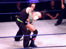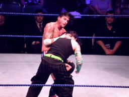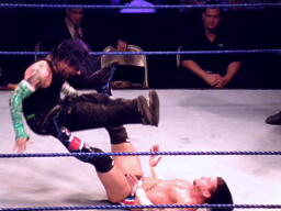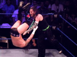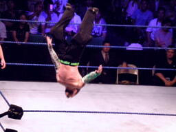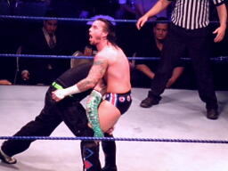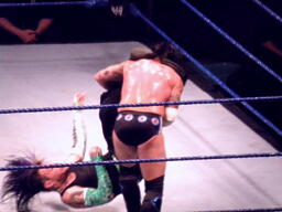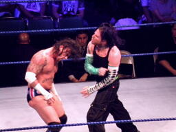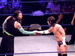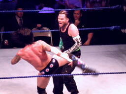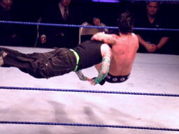 ジェフロープに振る、パンクはリープフロッグでかわす。ジェフが捕まえてツイスト・オブ・フェイト狙う、パンクブロックしてGTS狙いの体勢に、ジェフブロック。睨み合いに。