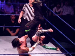 ジェフは腕ひしぎ十字固めに切り返す、パンクはロープエスケープ。