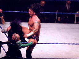 ジェフブレークしてパンチ連打。パンクは追い込まれながらもロープを引いてジェフを場外に落とす。