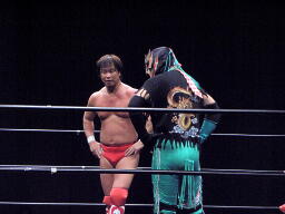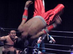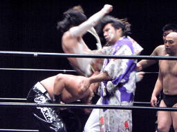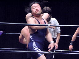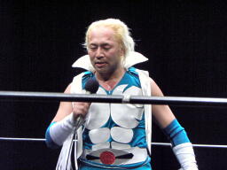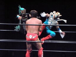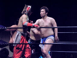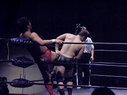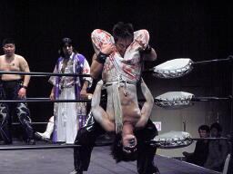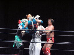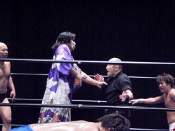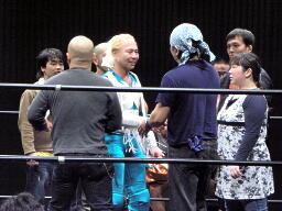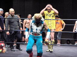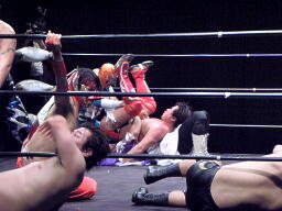 梅沢がバンジーに首固め、カウント3。V3ひっくり返す(右写真)、カウント3。2人とも退場。