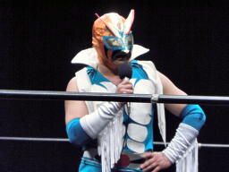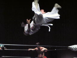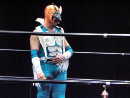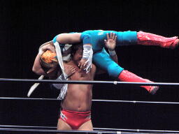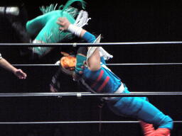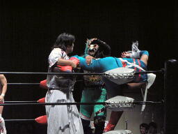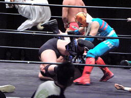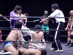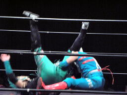 カラスがケブラーダ(左写真)、ディーノを越えて客席まで飛び、逃げられなかった西山浩司に直撃。西山浩司はうずくまったまま起き上がれず。カラスも失格。
