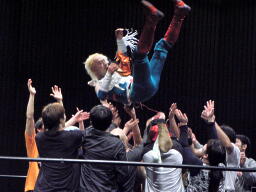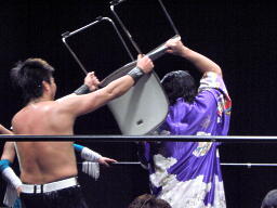 かと思ったら客席からイスを持ってきて殴ろうとする、KITOが止める(右写真)。