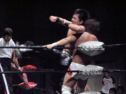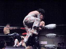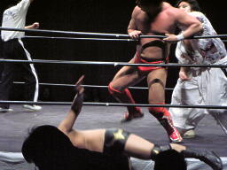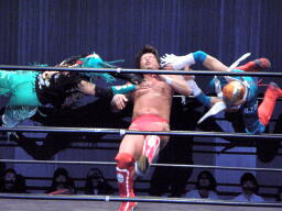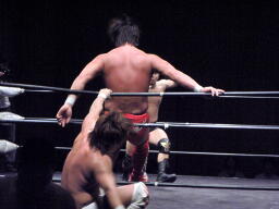 戸田が突っ込んで来た田村をオーバー・ザ・トップロープで落とす(左写真)。