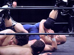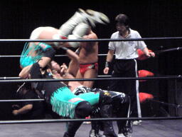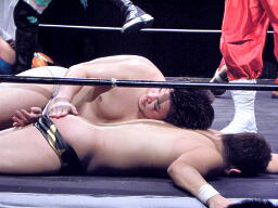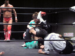 しかし田村とバードがダブルのドロップキックから2人でKITOを押さえ込む(左写真)、カウント3。40分経過。