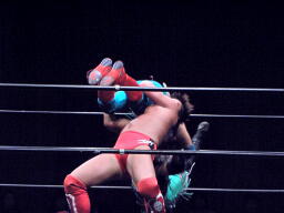 渡辺グラウンドコブラ(左写真)、カウント3。しかし引っくり返されて渡辺も退場に。