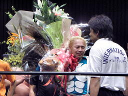 最後の花束贈呈(左写真)。15周年の花束かと思ったら全部引退への花束だったのだな。