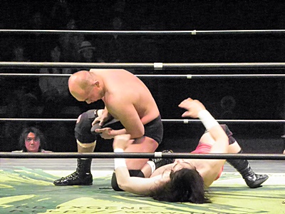 佐々木ウラカン・ラナ、高岩キャッチしてパワーボムに(左写真)。