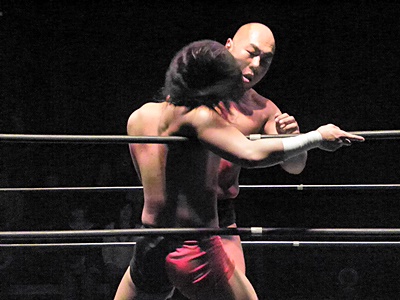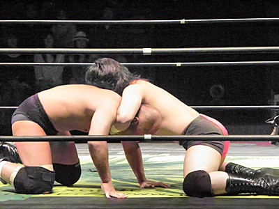 ロックアップ(左写真)、高岩がロープに押し込む、ブレーク。再度ロックアップ、高岩バック取る、佐々木切り返す、高岩腕を取る、佐々木切り返してひねる。