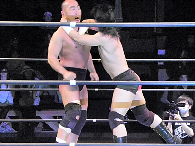 高岩逆水平、佐々木エルボー。高岩コーナーに詰めて逆水平連打(右写真)、ロープに振ってエルボー、カウント1。