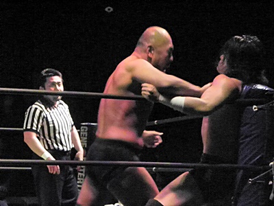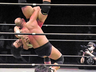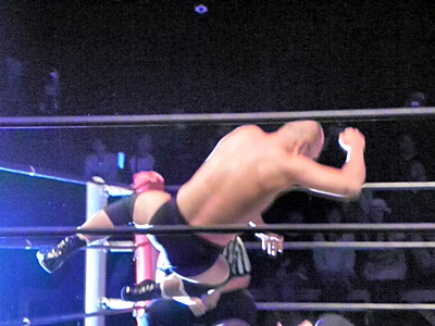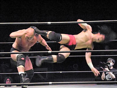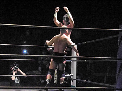 高岩ラリアット(右写真)、佐々木2で返す。しかし最後はデスバレーボムでカウント3。