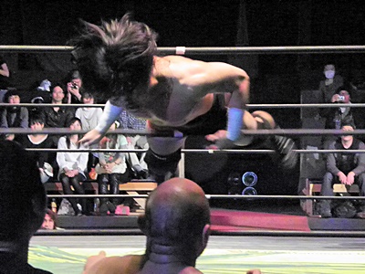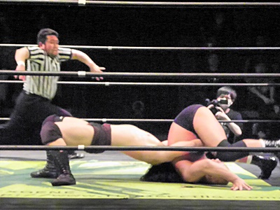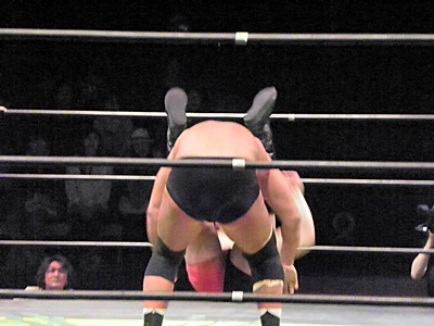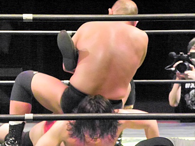 佐々木バック取る、高岩切り返す、佐々木ヒジでブレークしてロープに飛ぶ、高岩パワースラム(左写真)。