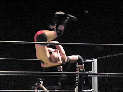 佐々木コーナーに振る、高岩切り返すが佐々木コーナーに飛び乗って延髄蹴り(左写真)。